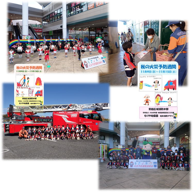 秋季火災予防運動期間中の令和7年11月10日(月)、常総地方幼年消防クラブ活動の一環として、学校法人わかば学園 認定こども園 もりや幼保園の園児たちによる火災予防啓発演奏会を行いました。アクロスモール守谷 カスミ松ヶ丘店前において、園児たち元気いっぱいの素晴らしい演奏を披露し、来客した多数のお客様方から盛大な拍手をあびておりました。演奏会後、防火法被に着替え作成したオリジナル防火チラシを配る広報活動を実施いたしました。園児たちが作成した防火チラシを直接受け取った方々からは、「ありがとう。上手に描けてるね。」とお褒めの言葉を頂戴いたしました。